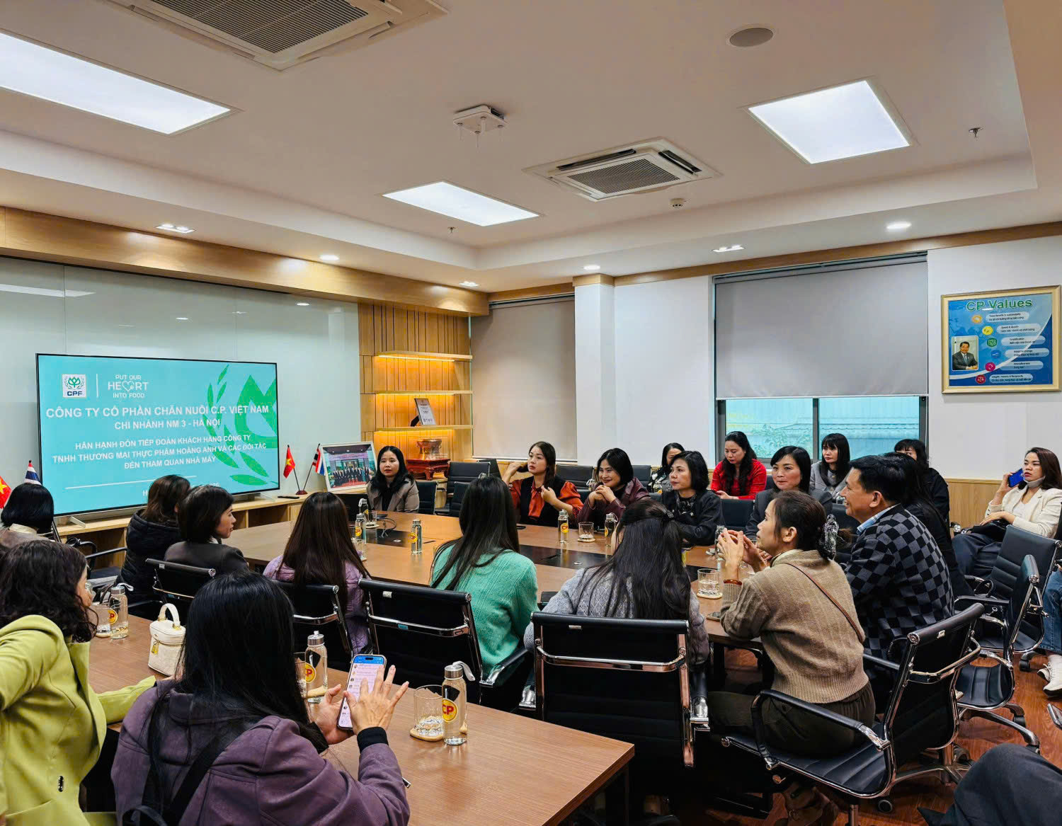 Đoàn lắng nghe Công ty cổ phần chăn nuôi C.P. Việt Nam chi nhánh Hà Nội giới thiệu về quy trình sản xuất của công ty.