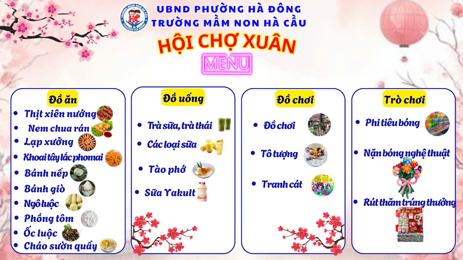 Trong không khí tưng bừng chào đón mùa xuân mới, Trường Mầm non Hà Cầu tổ chức chương trình “Hội chợ Xuân” với nhiều hoạt động hấp dẫn, mang đậm nét văn hóa truyền thống, tạo sân chơi vui tươi và ý nghĩa cho các con.