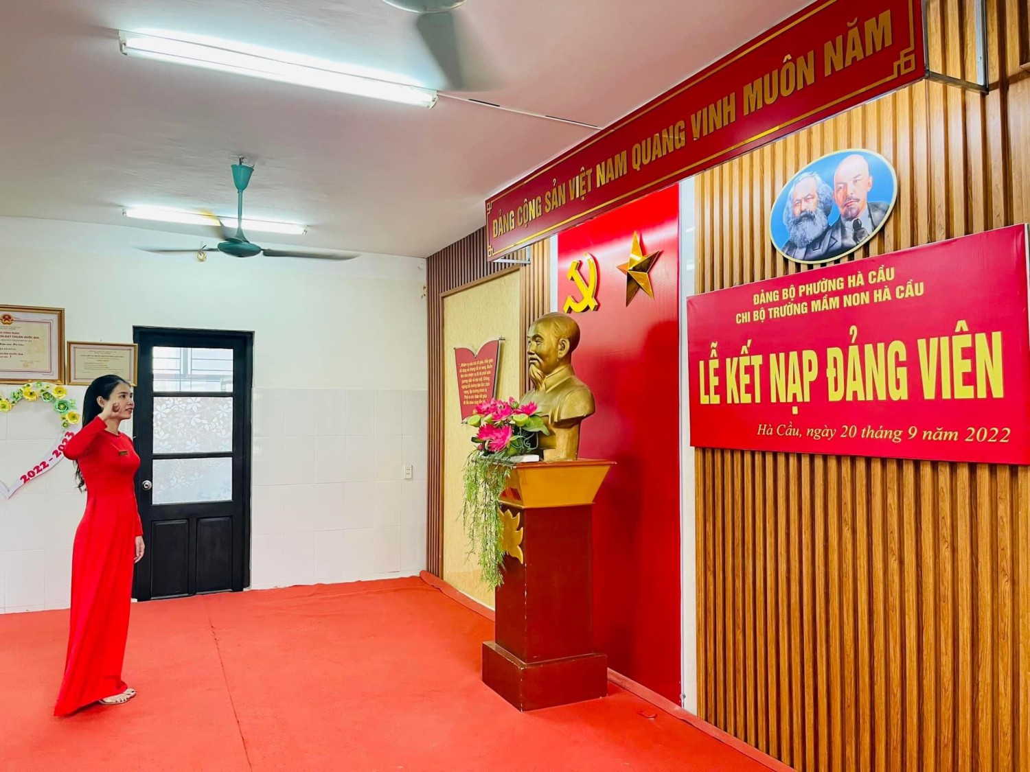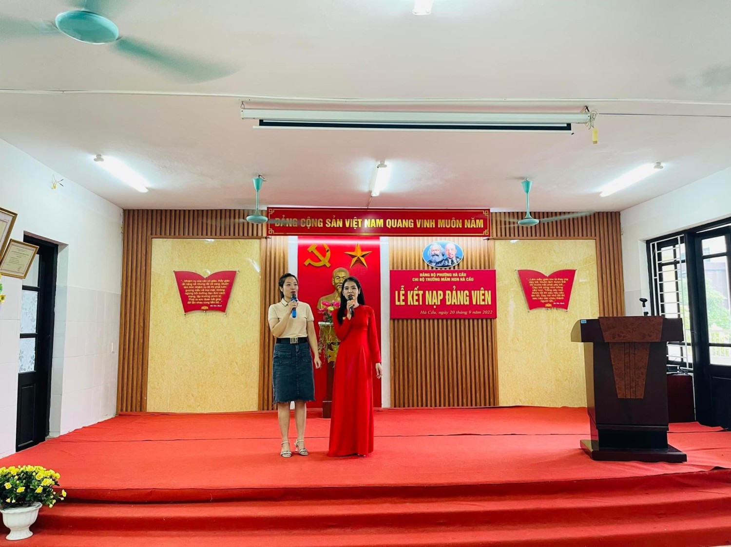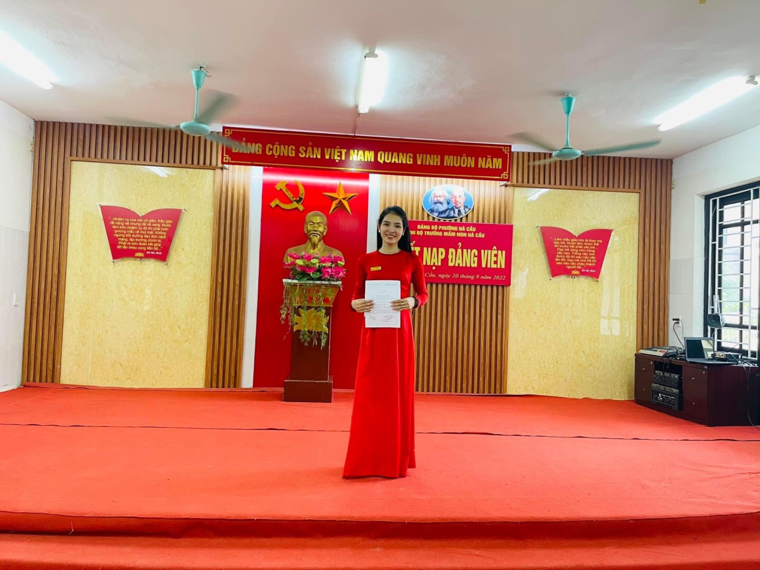 Bồi dưỡng, kết nạp đảng viên mới là nhiệm vụ thường xuyên, có ý nghĩa quan trọng trong công tác xây dựng Đảng, góp phần phát triển, nâng cao chất lượng và sức chiến đấu của tổ chức Đảng và đảng viên. Với ý nghĩa đó, hôm nay ngày 20/9/2022, Chi bộ trường mầm non Hà Cầu long trọng tổ chức Lễ kết nạp Đảng viên mới cho quần chúng ưu tú Nguyễn Thị Dinh.
